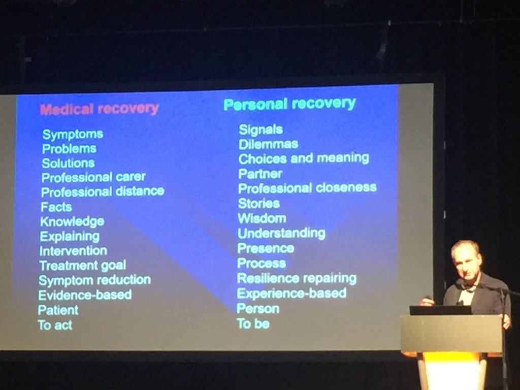 I was following the conference on the psychological and social approaches to psychosis (#ISPS2017UK). One of the tweets included Jim van Os’ juxtaposition of the medical recovery model with the personal one. In this post I want to offer comments of a linguist.